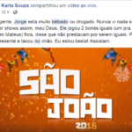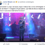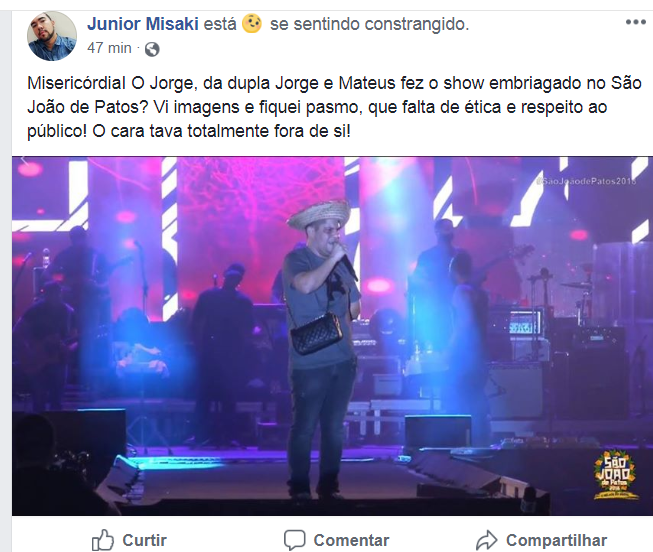“Misericórdia! O Jorge, da dupla Jorge e Mateus fez o show embriagado no São João de Patos? Vi imagens e fiquei pasmo, que falta de ética e respeito ao público! O cara tava totalmente fora de si” – Junior Misaki.