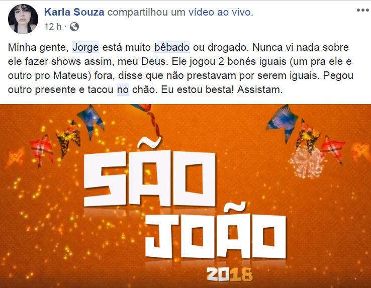 “Minha gente. Jorge está muito bêbado ou drogado. Nunca vi nada sobre ele fazer shows assim, meu Deus. Ele jogou dois bonés iguais (um pra ele e outro por Mateus) fora, disse que não prestavam por serem iguais. Pegou outro presente e tacou no chão. Eu estou besta! Assistam.” – Karla Souza.