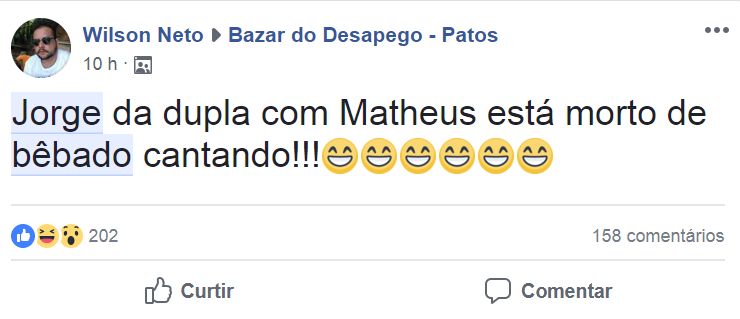 “Jorge da dupla com Matheus está morto de bêbado cantando!!!” – Wilson Neto.
