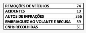 Durante todo o período junino foram lavrados 356 autos de infrações e 74 veículos foram removidos. Para o comandante da 4ª CPTRAN, Capitão Leonides, o êxito de todo o plano operacional se deve ao trabalho brilhante de todos os policiais. “Nosso efetivo é formado de pessoas guerreiras e extremamente profissionais. Foi um esforço que valeu a pena e que demonstrou todo o espírito de trabalho de nossos policiais para fazer com que as pessoas pudessem festejar em paz”.