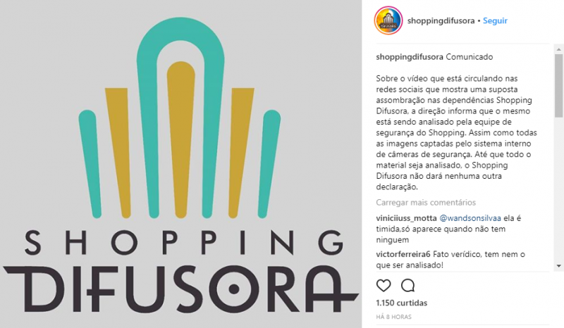 O burburinho em torno do vídeo é tamanho, que fez o shopping se manifestar publicamente em suas redes sociais. Em um comunicado publicado em seus perfis, o centro comercial avisa que a equipe de segurança do local está analisando o material. “Assim como todas as imagens captadas pelo sistema interno de câmeras de segurança. Até que todo o material seja analisado, o Shopping Difusora não dará nenhuma outra declaração”, avisa.