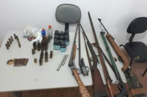 Duas espingardas, um rifle, armas artesanais, munições diversas, além de artefatos para fabricação artesanal de munição e diversos equipamentos de aprisionamento de animais e apetrechos usados na prática de caça predatória e pesca, foram apreendidas.