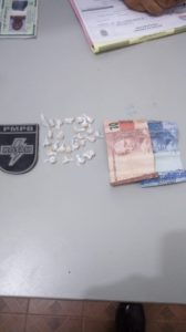 Em uma ação rápida os patrulheiros conseguiram interceptar Bruno Crispim Morais, 27 anos como suspeito. Na averiguação em cima do telhado foi localizado um “embrulho” com dinheiro e porções de substâncias semelhantes à maconha e crack.