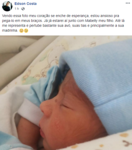 Quanto ao bebê, de nome João Manoel, o pai se enche de esperança e diz que neste momento ele está bem. Ele postou uma foto do bebê nas redes sociais, acompanhada da seguinte legenda: “Vendo essa foto meu coração se enche de esperança, estou ansioso pra pegá-lo em meus braços. Já já estarei aí junto com Mabelly e meu filho. Até lá me representa e perturbe bastante sua avó, suas tias e principalmente a sua madrinha”.