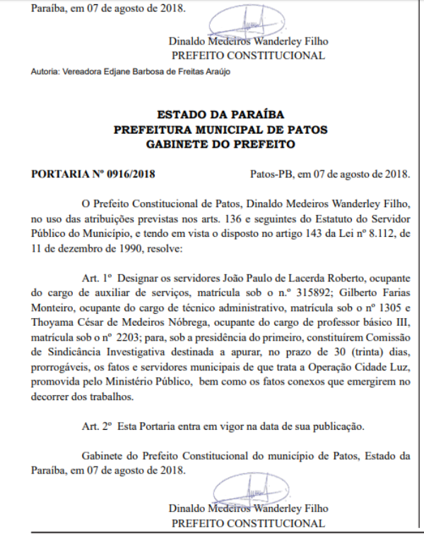 O prefeito de Patos, Dinaldo Wanderley (PSDB), tornou público através do Diário Oficial desta terça-feira, dia 07, a nomeação dos servidores que integram a Comissão de Sindicância Investigativa para apurar os fatos sobre a Operação Cidade Luz, deflagrada pelo Ministério Público Estadual.