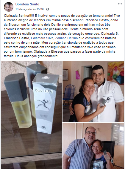 A artesã ficou desesperada e fez uma postagem nas redes sociais, pedindo ajuda. Muita gente ficou sensibilizada com a situação e a jovem patoense Aretusa Delfino enviou um e-mail para a Blosson, contando a situação. O e-mail chegou ao conhecimento da gerente da empresa, de nome Edlamara Silva, que passou a tentar encontrar uma unidade do perfume nos estoques da empresa.