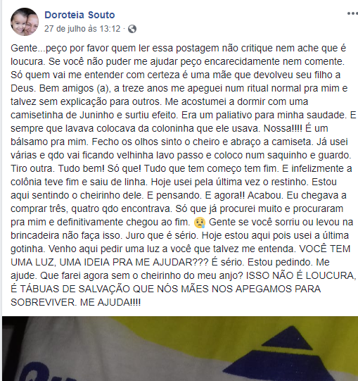 A história de Dona Doroteia sensibilizou seus amigos e familiares, pois todos sabem que desde que o filho Juninho faleceu, há 13 anos, que a vida dela mudou e até hoje ela comenta sobre ele com um tom de muita tristeza e saudade. “Se alguém ainda tiver essa colônia em casa pode me ligar (83 – 98735-1075) que eu compro”, finalizou a sofrida mãe.