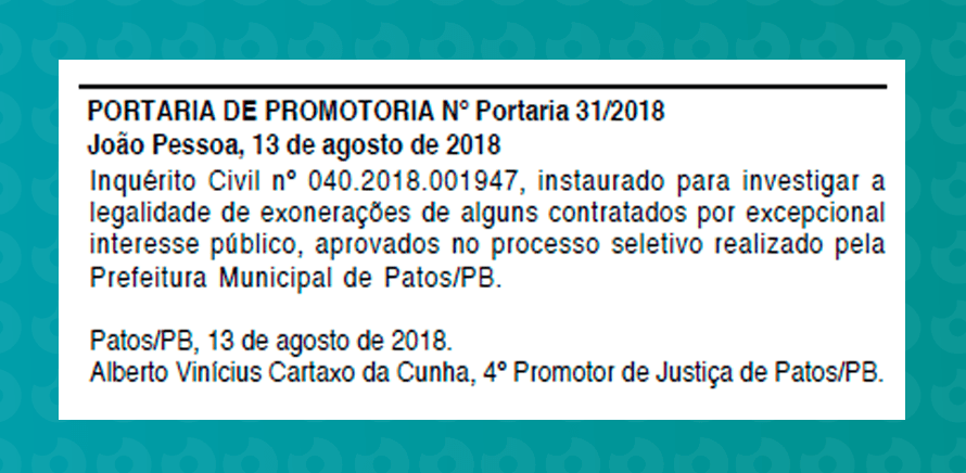 O 4º Promotor de Justiça de Patos, Alberto Vinícius Cartaxo da Cunha, é quem assina a portaria da investigação.
