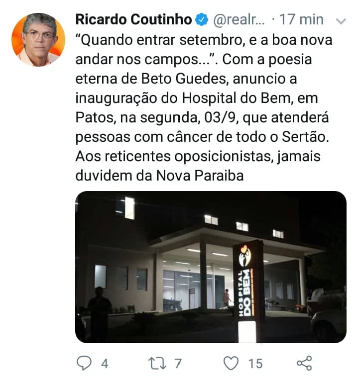 A data da inauguração do Hospital do Bem foi anunciada na tarde desta terça-feira (28) pelo governador Ricardo Coutinho. Este será o primeiro Centro Especializado de Câncer do interior do Nordeste e atenderá mais de 900 mil pessoas de 80 municípios. Nele serão tratados os tipos de câncer mais incidentes da população: mama, colo do útero, próstata, cabeça e pescoço. A expectativa de atendimento é de 8 mil procedimentos por ano, incluindo atendimento laboratorial, quimioterapia e cirurgias.