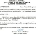 A ex-vereadora Isis Carla, que havia sido exonerada por Bonifácio da presidência da Fundação Cultural do Município de Patos (FUNDAP) e colocada como secretária executiva da mesma entidade, no lugar do atual presente do órgão, Deleon Souto, acabou sendo exonerada pela segunda vez pelo prefeito em pouco mais de 15 dias.