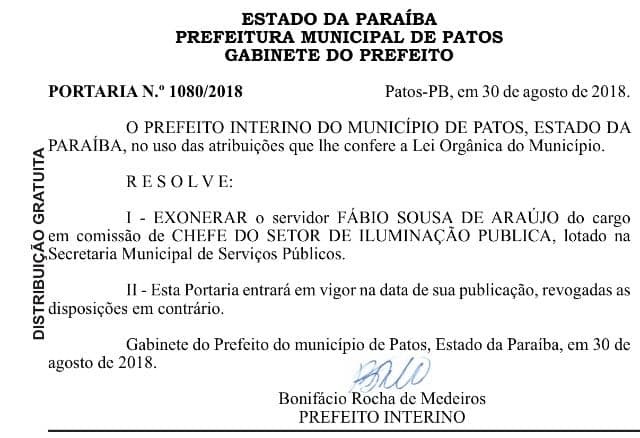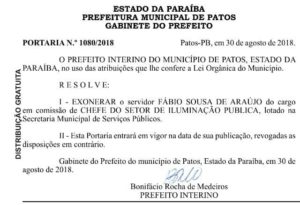 Já em um dos setores da Secretaria de Serviços Públicos, Fábio Sousa Araújo, foi exonerado do cargo de Chefe do Setor de Iluminação Pública.