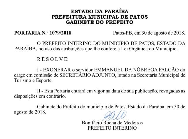 Outra exoneração publicada no Diário é de outro ex-vereador, Emmanuel Falcão, que ocupava a secretaria-adjunta de Esporte e Turismo.
