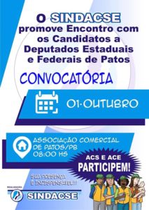O SINDACSE (Sindicato dos Agentes Comunitários de Saúde e Agentes de Endemias de Patos e Região) promove na segunda-feira, 01 de outubro, um debate com os principais candidatos a deputado estadual e federal de Patos. O evento acontecerá na Associação Comercial e Industrial de Patos, a partir da 08:00 horas.