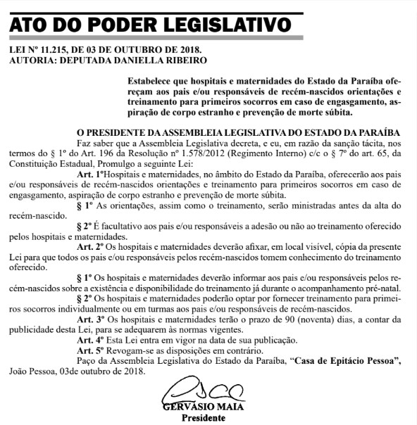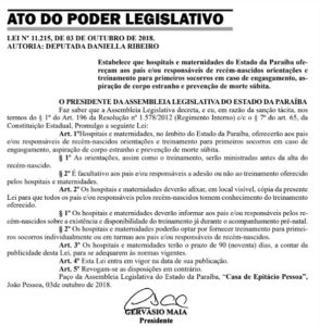 Os hospitais e maternidades de toda a Paraíba terão que oferecer treinamento de primeiros socorros e orientações para os pais de bebês recém-nascidos antes de dar alta. A edição desta quinta-feira (04) do Diário Oficial do Estado trouxe a promulgação da lei de autoria da deputada Daniella Ribeiro.