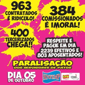 Em assembleia geral marcada para as 8 horas na sede da entidade, os servidores de Patos irão deliberar greve por tempo indeterminado caso o atual gestor continue atrasando salários, além de não cumprir o acordo homologado pelo TJPB.