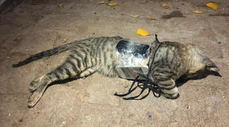 De acordo com a Polícia Militar, o animal estava com três aparelhos presos por fita isolante em seu corpo, que o destino seria uma das celas da unidade prisional.