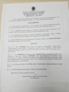 Fica permitida a abertura dos estabelecimentos comerciais da Zona Eleitoral no dia das eleições, mas em caso de flagrante de venda, troca, distribuição ou doação de bebidas alcoólica, eles serão fechados pela polícia de forma imediata, com consequente punição do responsável pela infração penal na forma da lei.