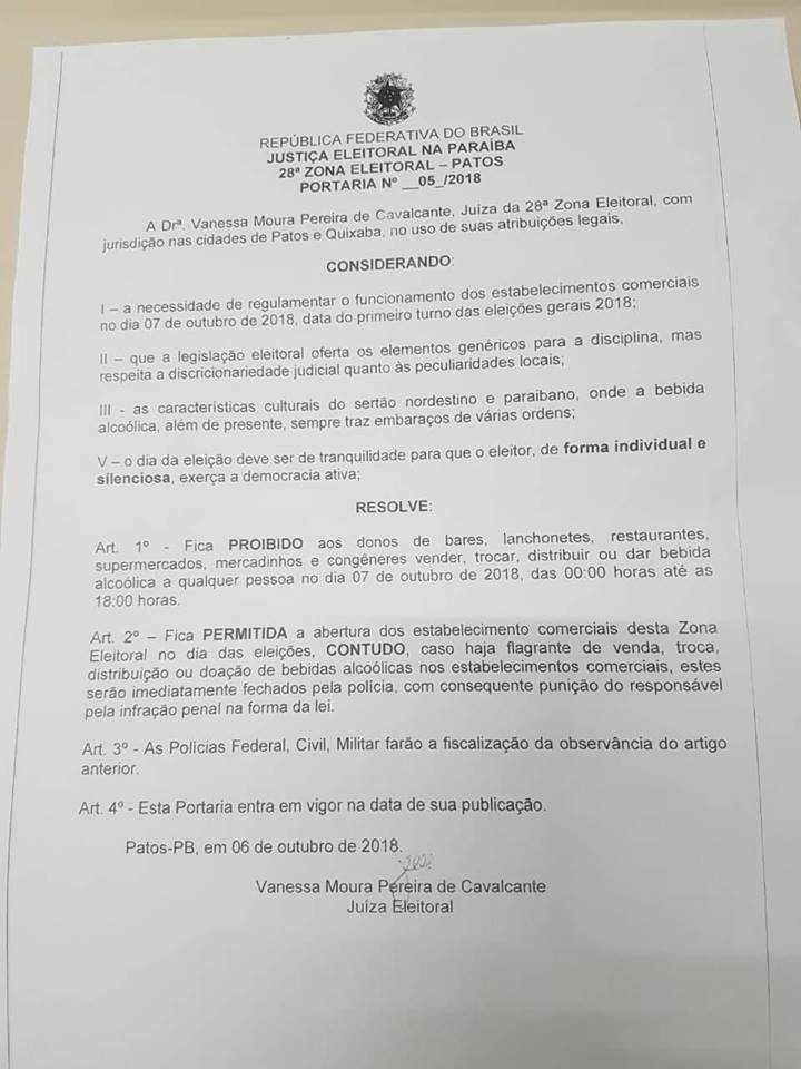 A juíza eleitoral doutora Vanessa Moura Pereira de Cavalcante, da 28ª Zona Eleitoral, com jurisdição nos municípios de Patos e Quixaba, baixou uma portaria proibindo a venda, troca e distribuição de bebida alcoólica entre meia-noite e 18 horas deste domingo, 07/08, dia em que ocorrem as eleições 2018.