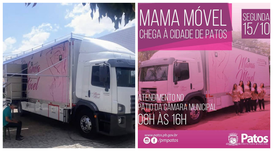 Nesta segunda-feira (15), das 08h às 16h, estarão sendo realizados, no pátio da Câmara Municipal de Patos, vários exames de saúde, para as mulheres patoenses, tais como: mamografias, teste de glicemia, aferição de Pressão Arterial, dentre outros, através da carreta do Programa Estadual do controle do câncer de mama.