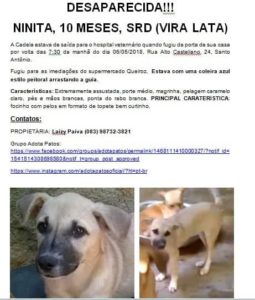 Quem tiver informações sobre o paradeiro, entrar em contato com a dona do animal, a professora Laizy Paiva, pelo telefone (83) 9.8732-3821.