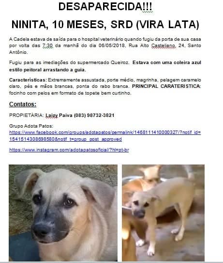 Procura-se a cadelinha Ninita, de 10 meses, que fugiu da porta de casa, na Rua Alto Casteliano, nº 24, no bairro Santo Antônio, em Patos.