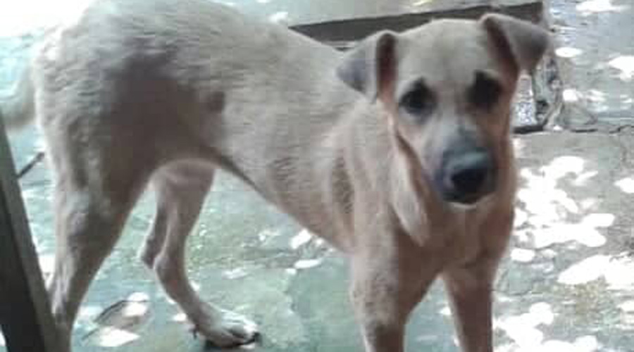 O animal, sem raça definida, possui a ponta do rabo e as quatro patas brancas, está de coleira peitoral azul arrastando a guia. Ela é extremamente assustada, possui porte médio, é magrinha, tem pelagem caramelo claro e sua característica principal é o focinho com pelos em formato de topete bem curtinho.