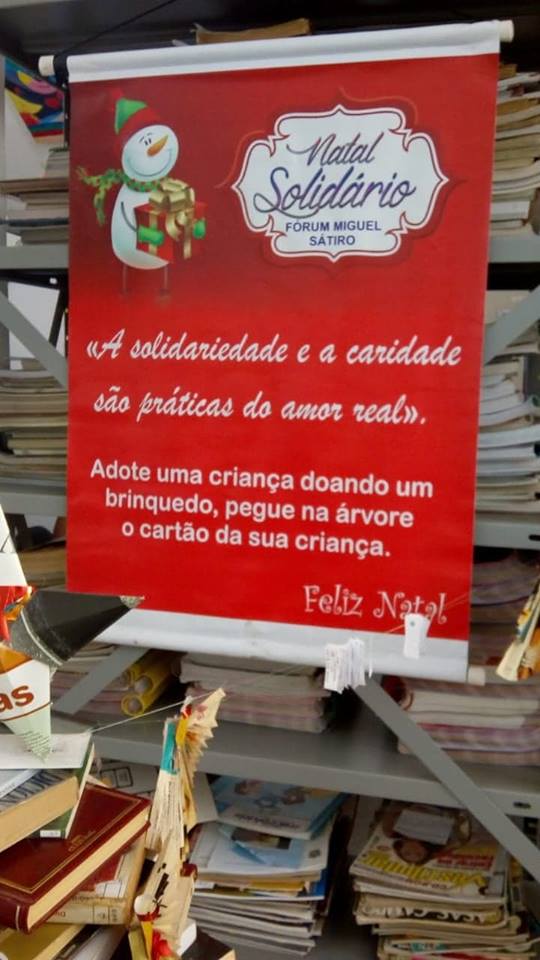 Iniciou nesta semana, no Fórum Miguel Sátyro, em Patos, a terceira campanha de arrecadação de brinquedos, denominada Natal Solidário. A campanha é voltada para ajudar as crianças que se encontram em estado de vulnerabilidade social. “Uma árvore de livros foi montada com enfeites reciclados”, explica Marlete Lucena, funcionária do Fórum Miguel Sátyro.