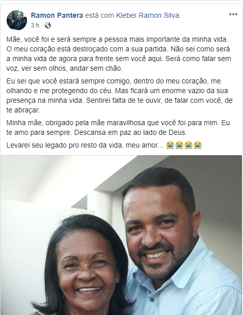 Leia abaixo uma mensagem escrita pelo filho dela Kleber Ramon, também conhecido como Ramon de Chica Pantera, vereador do PTN e bombeiro militar, em Patos: