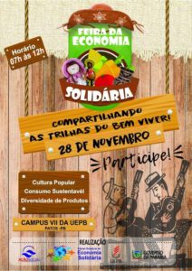 “Cultura popular”, “consumismo sustentável” e “diversidade de produtos”. Como parte do projeto Univer-Cidade, concebido através do Mestrado em Desenvolvimento Regional da Universidade Estadual da Paraíba (UEPB), será realizada, no próximo dia 28 de novembro, a 2ª Feira da Economia Solidária do Centro de Ciências Exatas e Sociais Aplicadas (CCEA), Câmpus VII, em Patos.