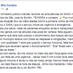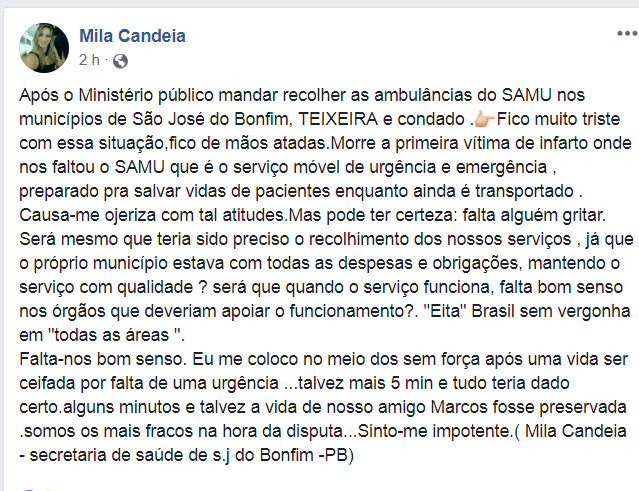 ”Após o Ministério público mandar recolher as ambulâncias do SAMU nos municípios de São José do Bonfim, TEIXEIRA e condado Fico muito triste com essa situação, fico de mãos atadas. Morre a primeira vítima de infarto onde nos faltou o SAMU que é o serviço móvel de urgência e emergência , preparado pra salvar vidas de pacientes enquanto ainda é transportado . Causa-me ojeriza com tal atitudes. Mas pode ter certeza: falta alguém gritar.
