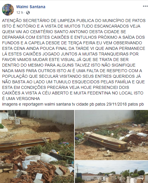 O repórter Walmi Santana, da TV Cidade, esteve recentemente no Cemitério Santo Antônio, no bairro Monte Castelo, em Patos e presenciou uma situação revoltante e desrespeitosa: caixões jogados ao ar livre, muita fedentina e lixo nos fundos e na capela do local Ele acompanha a situação desde a terça-feira, 27/11, e chama atenção da Secretaria Municipal de Serviços Públicos de Patos, para que as providências sejam tomadas.
