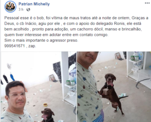 Bob foi levado para a residência do protetor Patrian Júnior e depois para o Canil Municipal. “Ele está pronto para adoção. É um cachorro dócil, manso e brincalhão, quem tiver interesse em adotar entre em contato comigo pelo telefone 999541671”, disse Patrian.