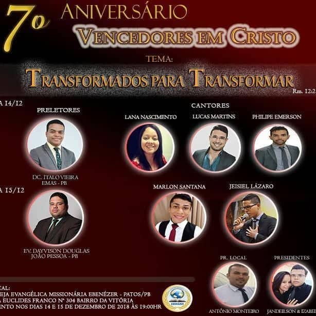 A Igreja Evangélica Missionária Ebenézer, situada na Rua Euclides Franco, 304, no Bairro da Vitória em Patos, convida toda a comunidade e igrejas da cidade para participar do 7° aniversário do conjunto de jovens Vencedores em Cristo nos dias 14 e 15 de dezembro às 19 horas no templo da igreja.