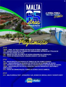 Na tarde dessa terça-feira, 18, o prefeito de Malta Nael Rosa fez a divulgação oficial da programação que será desenvolvida para marcar o aniversário de 65 anos de emancipação política da cidade. O aniversário da cidade é no dia 26 de dezembro.