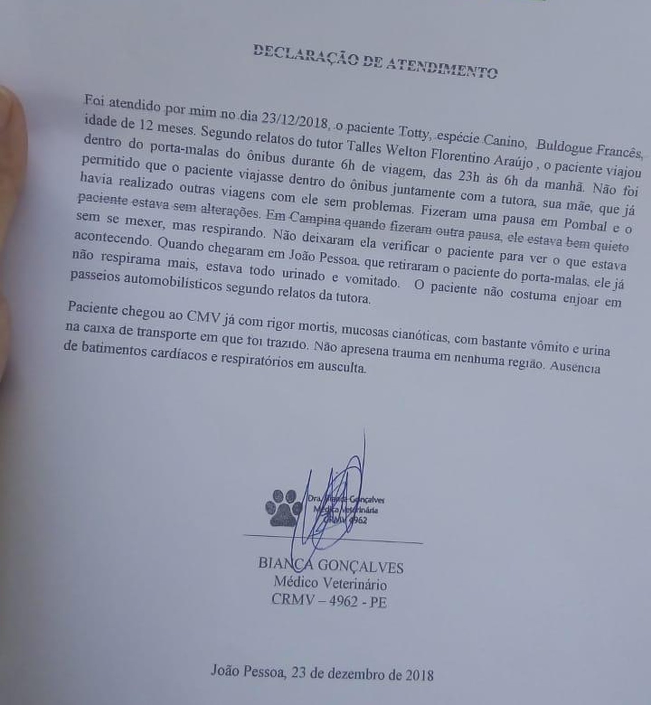 Ao chegar em João Pessoa, o animal já estava sem vida. A família levou o cão para uma clínica veterinária para atestar a causa da morte. O laudo veterinário informa que o paciente “não apresenta trauma em nenhuma região. Ausência de batimentos cardíacos e respiratórios”. Um boletim de ocorrência foi registrado pela família para que a a Polícia Civil investigue o caso.