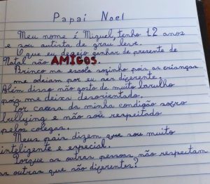 Uma carta que circula nas redes sociais, tem despertado muitos comentários e compartilhamentos. Isto porque o texto é de um garoto de 12 anos autista que pede amigos como presente de Natal a Papai Noel.