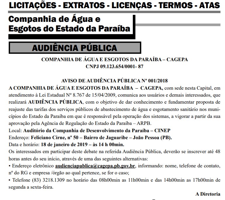 A Audiência Pública acontecerá no dia 18 de janeiro de 2019, às 14h, no auditório da Companhia de Desenvolvimento da Paraíba – CINEP, no bairro de Jaguaribe, em João Pessoa. Os interessados em participar da Audiência Pública deverão se inscrever até 48 horas antes do início, através de uma das seguintes alternativas: