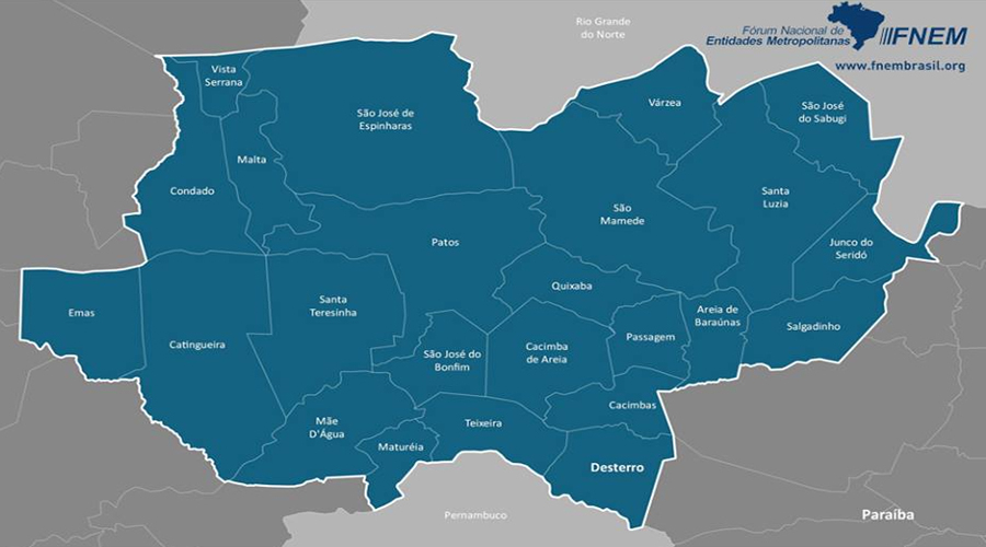 A Região Metropolitana do Sertão da Paraíba, como também é chamada, agrega 24 municípios: Areia de Baraúnas, Cacimba de Areia, Cacimbas, Catingueira, Condado, Desterro, Emas, Junco do Seridó, Mãe D’Água, Malta, Matureia, Passagem, Patos, Quixaba, Salgadinho, Santa Luzia, Santa Teresinha, São José de Espinharas, São José do Bonfim, São José do Sabugi, São Mamede, Teixeira, Várzea e Vista Serrana. Juntos, eles somam uma população de quase 240 mil habitantes.