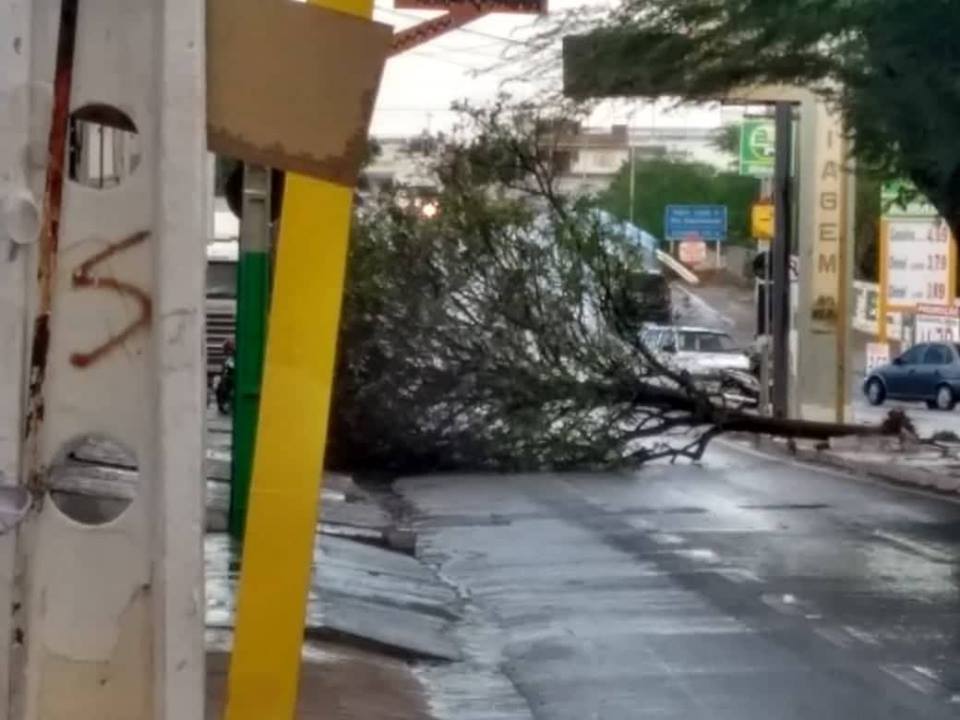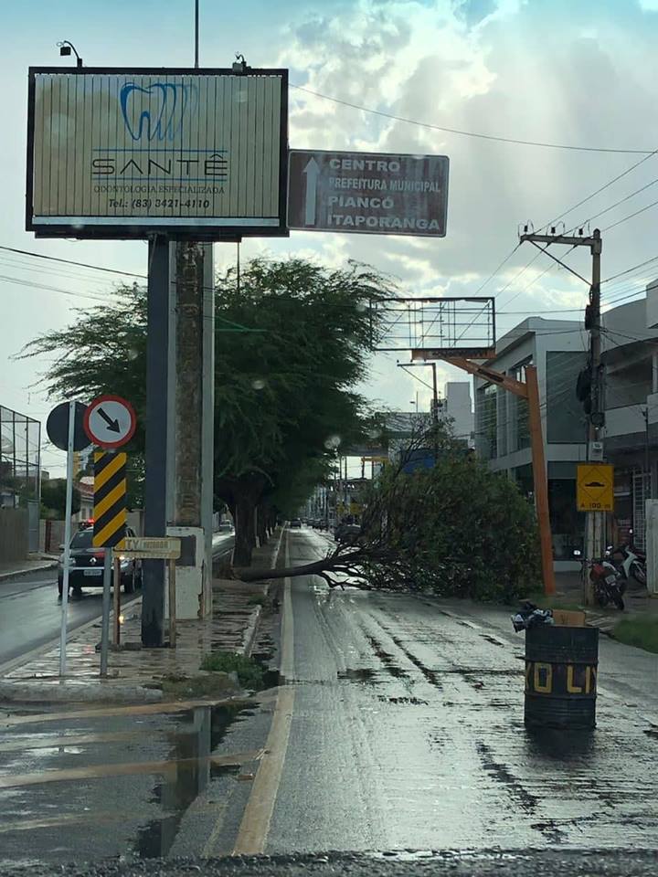 A pancada de chuva que caiu em Patos por volta das 15h30min não foi suficiente para afugentar o calor, mas derrubou uma algaroba na Rua Pedro Firmino, no Bairro da Brasília, em Patos, próximo à loja Casa Pronta.
