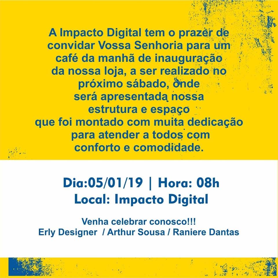 A Gráfica Impacto Digital promoverá um café da manhã de inauguração da loja em Patos, que será realizado neste sábado, 05/01, a partir das 8 horas, na Rua José Gomes Alves, s/n, Centro (descida da Ponte do São Sebastião).