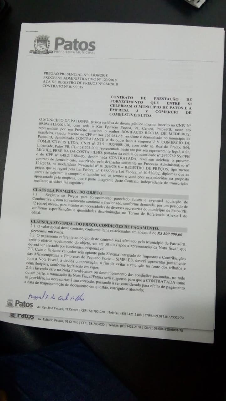 Nesta manhã (04), no Centro Administrativo, se deu a assinatura do referido contrato de aditivo, feito pelo senhor Miguel Pereira, representante do posto JV Comércio de combustível LTDA, o qual se prontifica de continuar fornecendo à Prefeitura de Patos, pois não houve qualquer impedimento outro que não fosse a inexistência do mesmo para o abastecimento da frota.