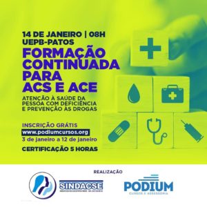 O Sindicato dos Agentes Comunitários de Saúde e Agentes de Combate as Endemias de Patos e Região (SINDACSE) está promovendo juntamente com o Podium Cursos e Assessoria, uma capacitação aos profissionais agentes comunitários de saúde e agentes de combate às endemias de Patos, quevai acontecer na segunda-feira, dia 14 de janeiro, das 08 horas às 12 horas, no auditório da Universidade Estadual da Paraíba – UEPB Campus VII, no bairro Salgadinho, na zona leste de Patos. A inscrição pode ser feita gratuitamente até amanhã (sábado, 12) no site www.podiumcursos.org e os participantes contará com a emissão de certificado.