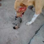 Clara teve filhotes há poucos dias, mas devido à gravidade da lesão não terá com alimentá-los e em breve irão para a adoção.