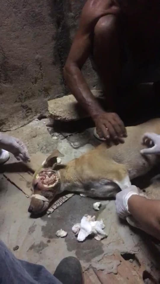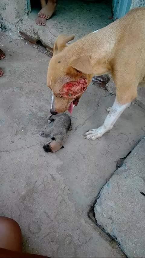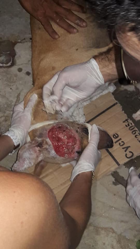 Clara teve filhotes há poucos dias, mas devido à gravidade da lesão não terá com alimentá-los e em breve irão para a adoção.