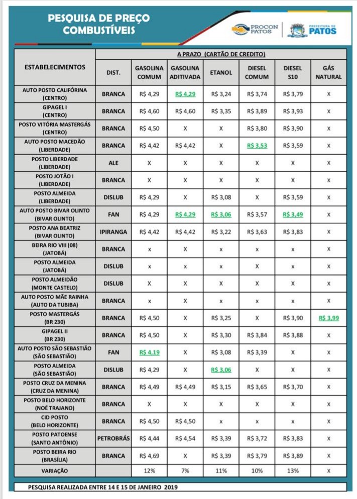 Visando manter o consumidor patoense bem informado, com relação aos valores aplicados nos postos de combustíveis da cidade, a Secretaria de Defesa do Consumidor (PROCON Patos), realizou durante os dias 14 e 15 de janeiro, a primeira pesquisa de preços de combustíveis de 2019.