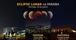 Em João Pessoa, um lual será realizado na Estação Cabo Branco de Ciência, Cultura e Artes durante toda a noite. O evento encerrará a exposição “O Homem e o Universo” que comemora os 50 anos de dedicação à Astronomia do Prof. Marcos Jerônimo. Para acompanhar o eclipse, serão disponibilizados telescópios a partir das 18h do domingo, dia 20. Até o horário do eclipse, além de observação da Lua por telescópios, o público contará ainda com palestras e apresentações musicais no palco do anfiteatro. O eclipse também poderá ser acompanhado em tempo real em um telão instalado especialmente para o evento.