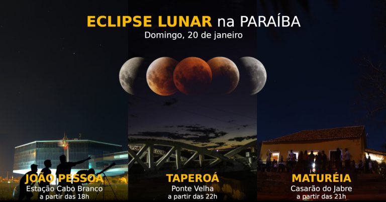Entre domingo (20) e segunda (21), ocorrerá um dos principais eventos astronômico de 2019: um eclipse lunar total que será inteiramente visível de todo o Brasil. Na Paraíba, se as condições meteorológicas ajudarem, será possível observar o fenômeno por mais de 3 horas, a partir da 0h33m.