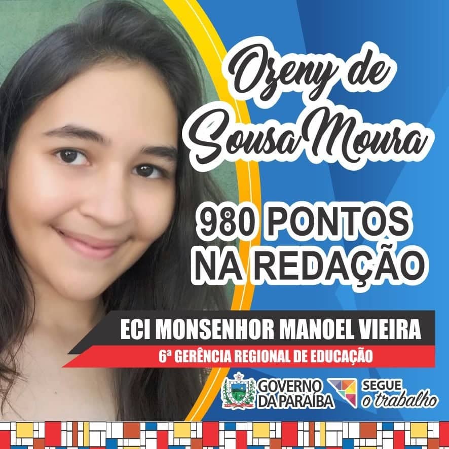 Ozeny de Sousa Moura é aluna da Escola Cidadã Integral Estadual Monsenhor Manuel Vieira e está entre as melhores pontuações de redação do ENEM 2018 no Estado da Paraíba: 980 pontos. Ozeny teve que desenvolver uma redação com um dos temas considerados mais difíceis em provas do ENEM: “Manipulação do comportamento do usuário pelo controle de dados na internet”. Segundo o Instituto Nacional de Estudos e Pesquisas Educacionais Anísio Teixeira (Inep), apenas 55 candidatos em todo o país alcançaram nota máxima na redação.