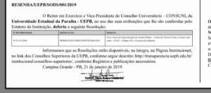 O Reitor em Exercício e Vice-Presidente do Conselho Universitário – CONSUNI, da Universidade Estadual da Paraíba – UEPB, no uso das suas atribuições que lhe são conferidas pelo Estatuto da Instituição, deferiu a seguinte Resolução: