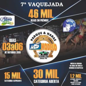 Acontece de 3 a 6 de outubro, no Parque & Haras MS Modelo, no município de Emas, na Região Metropolitana de Patos, a 7ª Vaquejada.